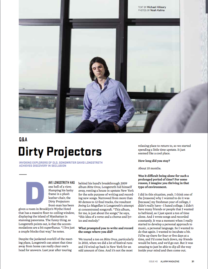 Dave Longstreth has one hell of a view. Slumping his lanky frame in a plush leather chair, the Dirty Projectorsfront-man has been given a room in Brooklyn’s Wythe Hotel that has a massive floor-to-ceiling window, displaying the island of Manhattan in stunning panorama. The funny thing, as Longstreth points out, is that the accommodations are a bit superfluous. “I live just a couple blocks that way,” he notes.