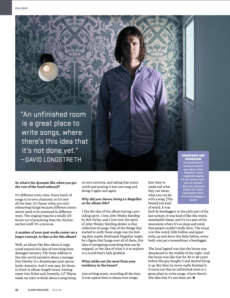 Dave Longstreth has one hell of a view. Slumping his lanky frame in a plush leather chair, the Dirty Projectorsfront-man has been given a room in Brooklyn’s Wythe Hotel that has a massive floor-to-ceiling window, displaying the island of Manhattan in stunning panorama. The funny thing, as Longstreth points out, is that the accommodations are a bit superfluous. “I live just a couple blocks that way,” he notes.