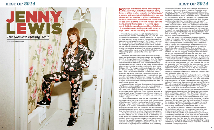 The lived-in wardrobe is, of course, but a small aspect of Lewis and her latest work. Not counting Lewis and Rice's 2010 joint LP as Jenny and Johnny, I'm Having Fun Now, The Voyager is Lewis' first collection of songs since 2008's Acid Tongue. It's also the first album she's made since her career-establishing band Rilo Kiley officially came to an end. Lewis' highest charting album to date-peaking at number nine in its first week on the Billboard 200-The Voyager most importantly plumbs a side of the 38-year-old artist she preferred to keep to herself. "It's me," says Lewis. "On my previous records I have created a lot of characters and written through the characters-and not to say this record is fully autobiographical-but I think it definitely feels more like me throughout and it reflects me as a solo artist. Everything, from the artwork to the song choices to the choices I made in regard to the collaborators, I think it just reflects me. There's a lot on the line with this one."
