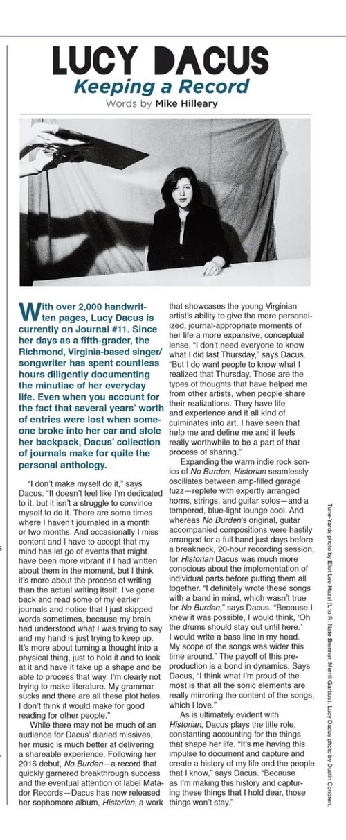 While there may not be much of an audience for Dacus' diaried missives, her music is much better at delivering a shareable experience. Following her 2016 debut, No Burden—a record that quickly garnered breakthrough success and the eventual attention of label Matador Records—Dacus has now released her sophomore album, Historian, a work that showcases the young Virginian artist's ability to give the more personalized, journal—appropriate moments of her life a more expansive, conceptual lense. "I don't need everyone to know what I did last Thursday," says Dacus. "But I do want people to know what I realized that Thursday. Those are the types of thoughts that have helped me from other artists, when people share their realizations. They have life and experience and it all kind of culminates into art. I have seen that help me and define me and it feels really worthwhile to be a part of that process of sharing."
